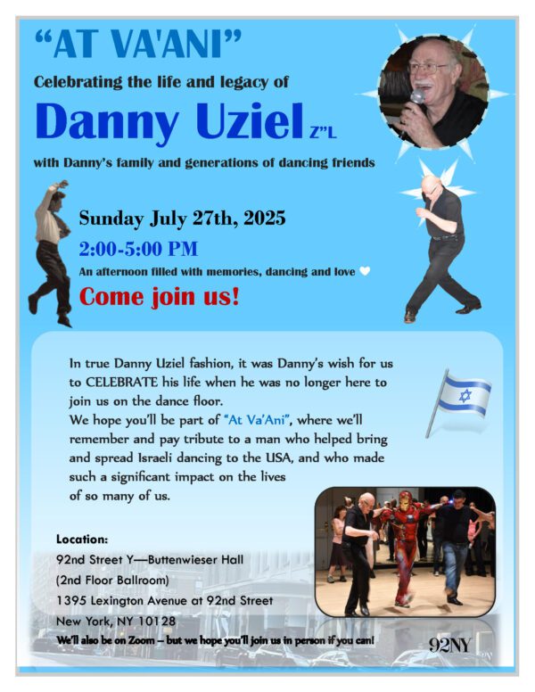 We hope you’ll be part of “At Va’Ani”, where we’ll remember and pay tribute to a man who helped bring and spread Israeli dancing to the USA, and who made such a significant impact on the lives of so many of us.